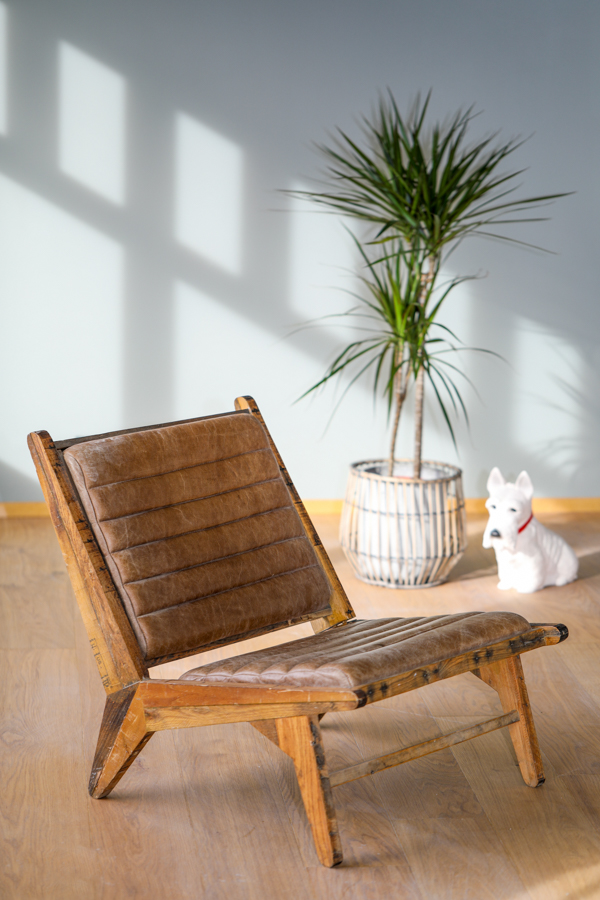 From our line of reclaimed wood furniture : Herra is a low sitting and slightly reclined lounge chair. True to our methods and ethos, Herra is made with reclaimed wood from repurposed shipping pallets and upcycled Icelandic leather.